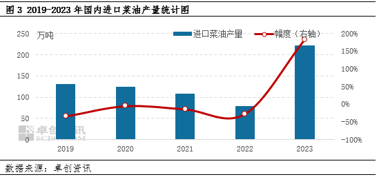 菜油进口量同样上升。2022年国内进口菜油供应缺口较大,因此2023年国内企业加大菜油进口力度,使得国内菜油进口量同比上升。据卓创资讯统计,2023年国内菜油进口量为235.9万吨,同比增加129.8万吨,增幅为122.34%。