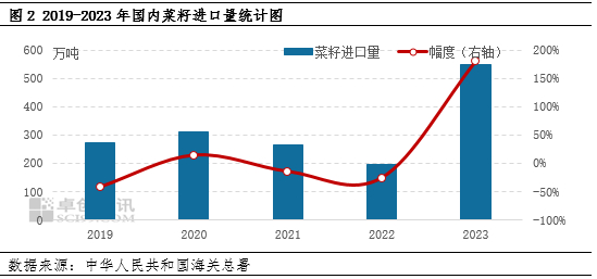 原料进口菜籽供应充足。2022年10月份加拿大新季菜籽大量上市,由于产量同比增加31.21%,因此出口可供应量上升,国内进口菜籽主要来源于加拿大,因此从2022年11月份开始,国内菜籽进口量明显增加。2023年多数月份菜籽进口量较2022年同期相比上升,使得2023年国内菜籽进口量增幅较大。据卓创资讯统计,2023年国内菜籽进口量在549.1万吨,同比增加353万吨,增幅为180.01%。