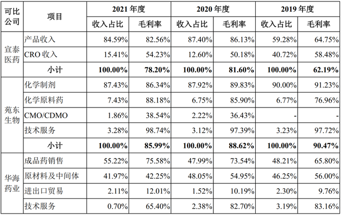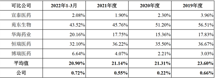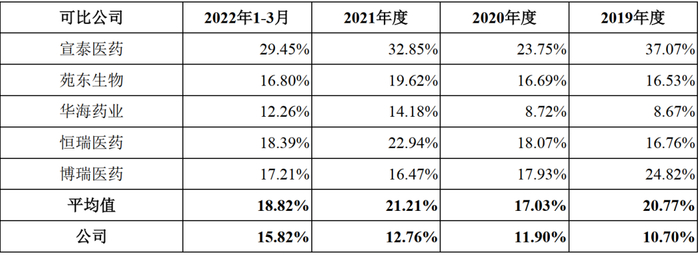 发行人列举了与宣泰医药、苑东生物、华海药业、恒瑞医药、博瑞医药5家可比公司的毛利率对比情况,上述5家公司都是主要做仿制药的企业,但是5家公司的毛利率都显著高于发行人近20个百分点。