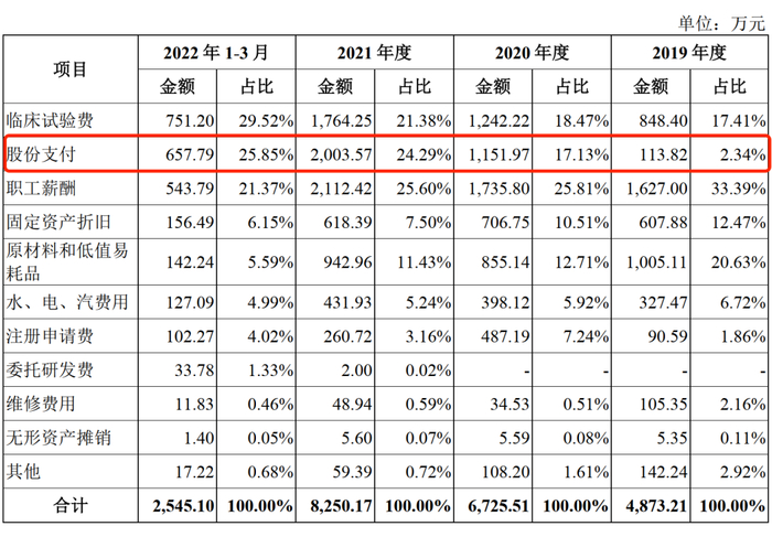 即使发行人的研发费用如此捉襟见肘,研发费用中还有25%左右的费用为股份支付。发行人的管理费用中50%是股份支付,而研发费用中仅有25%,从股份支付在不同费用中的占比,可以看出发行人的业务重心。公司对于研发人员的股份支付较为吝啬,这与自诩重视研发的高端医药制剂企业形象背道而驰,试问:在公司高端研发基本靠美国合作方,国内研发费用如此低的情况下,科创板上市的科创属性在哪里?