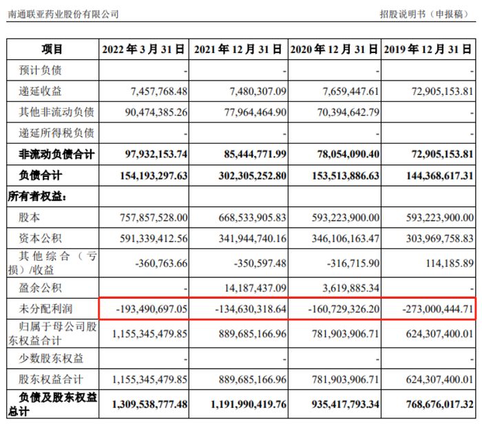 发行人报告期内各期末合并未分配利润均为巨额负数,截至2022年第一季度末发行人合并未分配利润为-193,490,697.05元,即在分红前存在巨额累计亏损。详见以下招股书截图: