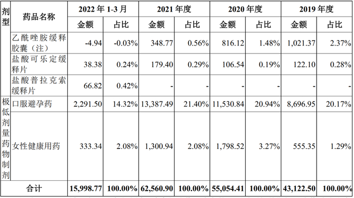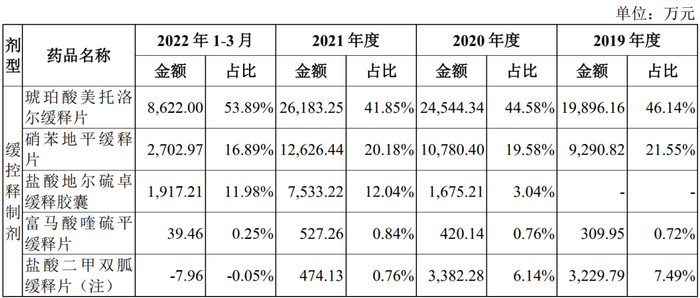 目前发行人的产品主要包括缓控释制剂,以及极低剂量药物制剂为代表的两大类仿制药。具体产品来看,缓控释制剂收入主要依赖琥珀酸美托洛尔缓释片、硝苯地平缓释片、盐酸地尔硫卓缓释胶囊和口服避孕药这四类产品,历年销售收入占制剂销售收入的比例分别为87.85%、88.15%、95.48%和97.09%。发行人产品销售收入按药品种类划分数据具体如下: