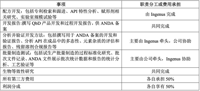 另外,从发行人披露的与Ingenus合作研发项目的分工细节也可以看出,Ingenus实际上主导整个研发过程。根据招股说明书披露,联亚药业与Ingenus合作研发多个缓控释制剂产品,双方共同负责产品研发,研发完成后产品由公司生产,Ingenus负责商业化推广,产品利润按照公司50%、Ingenus50%的比例分配。以下是二者的职责分工: