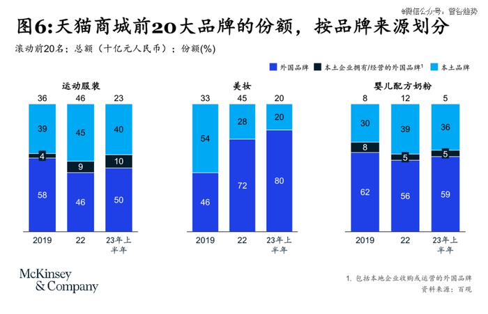 *,国货崛起的故事难续:麦肯锡的最新预测提到,虽然中国消费者声称更喜欢国产品牌,但在某些情况下,他们可能只是更钟意物有所值、并满足需求的品牌。2023年双11已有端倪,天猫商城外国品牌在运动服装、营养品的市场份额有所回升,美妆市场份额持续扩大。