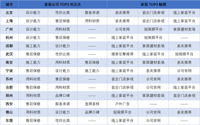 从消费者对装修的触媒来看,电商渗透率高的城市对线上家装平台的依赖度更高,包括杭州、成都、南京等城市;对用料材质特别关注的城市则更倾向于去装企门店或家居建材城现场参观,眼见为实、亲自体验相关产品的品质。