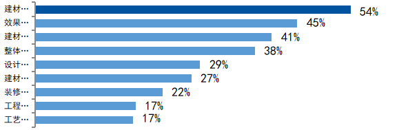在用户关心的家装信息方面,建材质量是最为关注的因素,占比超过五成;其次,用户对于家装效果和风格的期盼,也很强烈;因此,在家装前,让用户直观感受到实际效果异常重要。