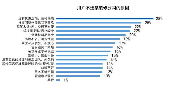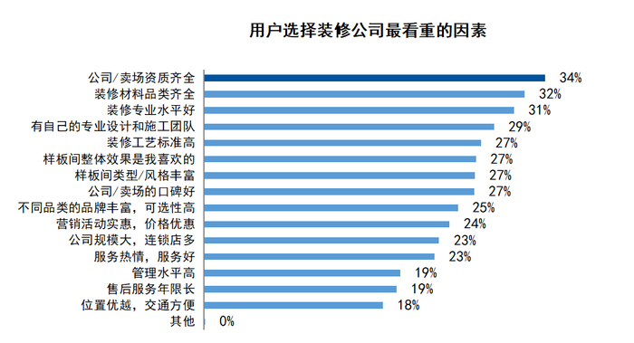 消费者选择装企主要看重资质、工艺、品类等。从用户家装公司选择原因来看,超过30%用户确定家装公司主要是看重其资质齐全,有保证;其次是装修材料品类全,装修水平高;用户在对比选择家装公司时,往往对价格比较敏感,占比28.4%;而家装效果带给用户的直观感受也非常重要;此外,装修卖场的位置和达到方便性是吸引用户前往的关键因素。
