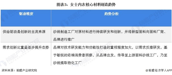 中国女士内衣材料技术方面相对成熟,创新主要集中在纱线、面料的功能性研发,由内衣常见的棉纺、丝绸、莫代尔等基础面料,逐步围绕吸湿排汗、抗菌、护肤、保暖、低碳环保等功能创新。上游纱线制造工厂是创新的主流源泉,但是随着品牌对研发能力、功能性产品开发的投入,基于用户需求洞察向上游反推的创新路径对材料创新的贡献作用日益凸显:例如女性消费者对护肤成分愈发敏感与关注,推动了内衣面料对胶原蛋白、山茶花油等护肤成分的添加,但其对穿着者皮肤的实际提升作用仍有待考察。越来越多的品牌与上游材料纱线、面料、化学提取物厂商开展技术共创,缩短从消费者需求到材料创新及应用落地的周期,加速材料功能性升级。