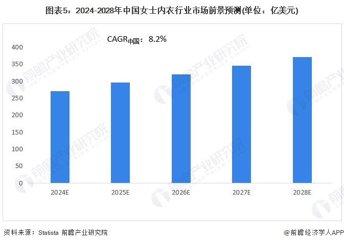 随着内衣消费观念升级及电商热度的加持,中国女士内衣技术储备转化速度将逐渐提升,未来中国市场规模也将得以稳步良性发展,预计到2028年我国内衣市场规模将达370亿美元,2024-2028年的年均复合增速将保持在8.2%左右。