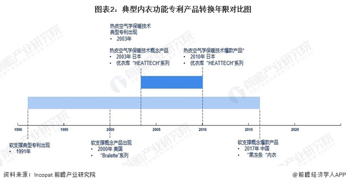 从技术转化年限看,产品功能专利技术的转化速度正在加快。分别选取2000年前后产品功能方向典型技术——“软支撑技术”与“热皮空气学保暖技术”相关产品发售时点情况进行对比,前者从1991年专利申报到2017年对应技术的爆款产品发售共计26年,后者的整体技术转换时长为7年,足见女士内衣产业对于需求市场响应速度及生产技术能力的不断提升。