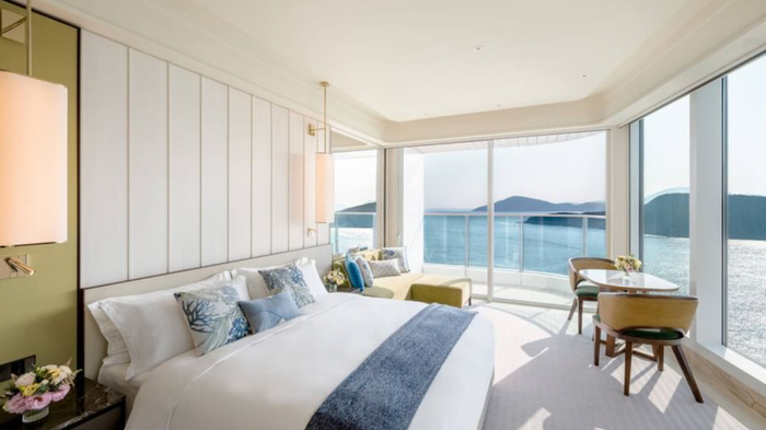 酒店依海而建,背靠南朗山,所有房间都享有超大的落地窗,拥有无敌的海景视野。4面海景大窗和室外阳台,连浴缸都坐拥唯美的海湾景色,超尺度的隐藏式吧台也是最大亮点。