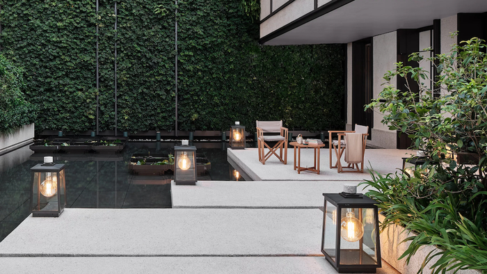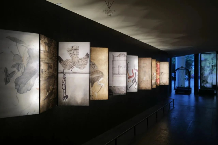 作为公区的高潮——全海景的大堂酒廊,卢志荣全然还原了最初的极简空间肌理,旨在让空间与海景的对话自然且纯粹。为了让落地窗在夜晚如影院幕布般展现澎湃的维港夜景,大堂内的所有光源,都被笼上了一款“提篮编织纹金属面纱”。