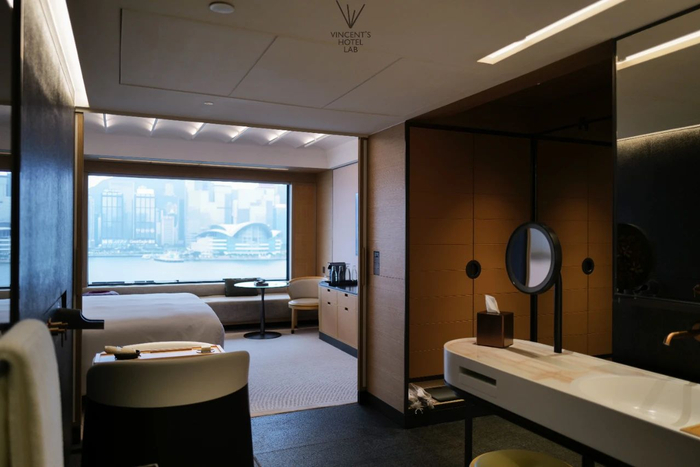 客房的屋顶采用了波浪顶设计,既呼应了维港的柔波,也为居室引入了野营帐篷感,用无尽的逍遥,致敬香港丽晶在40+年前开创的城中度假风潮。人们只需坐在房间里,透过落地窗看港岛和维港,所有的风景在面前流动,从早到晚坐一整天都不会看腻。入住的海景客房里其他引我反复推敲的笔触还包括:正对海景而置的宝座浴缸、莲蓬头般的化妆镜、藏着“竹林”的座厕间、隐藏式的弃物桶、倡导悬浮感的悬臂式的睡床和床边柜、安有旋盘坐垫的扶手椅。