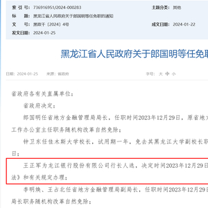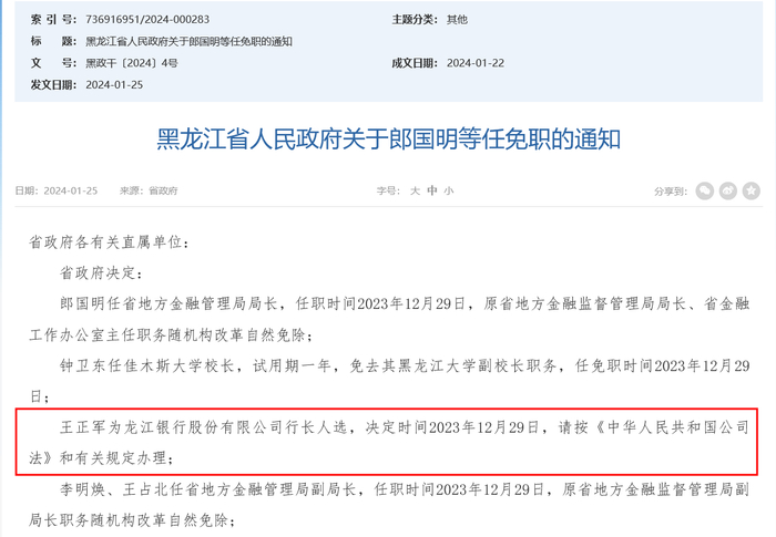 财联社1月26日讯(记者 彭科峰)1月25日晚间,黑龙江省人民政府官网发布了一批人事信息,任命王正军为龙江银行股份有限公司行长人选,决定时间2023年12月29日(按《中华人民共和国公司法》和有关规定办理)。这意味着自2023年9月原行长姜春洁升任董事长之后,龙江银行在半年后终于将迎来新一任行长。