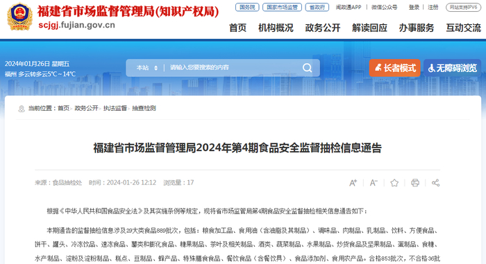 福建省市场监督管理局2024年第4期食品安全监督抽检信息通告