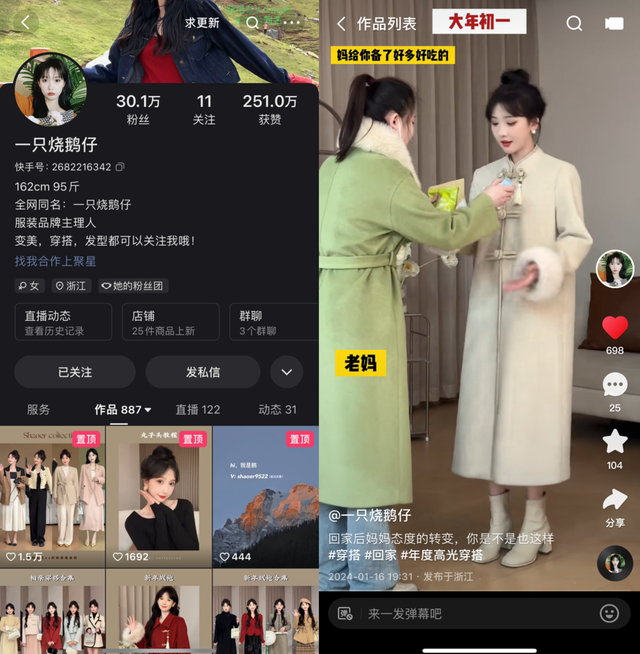 相较于潜移默化实现种草的“禾之韵”,诞生于环杭产业带的快手主播“一只烧鹅仔”更倾向于新中式服装美的具象展现,聚焦生活场景的穿搭内容成为账号经营的主要方向。