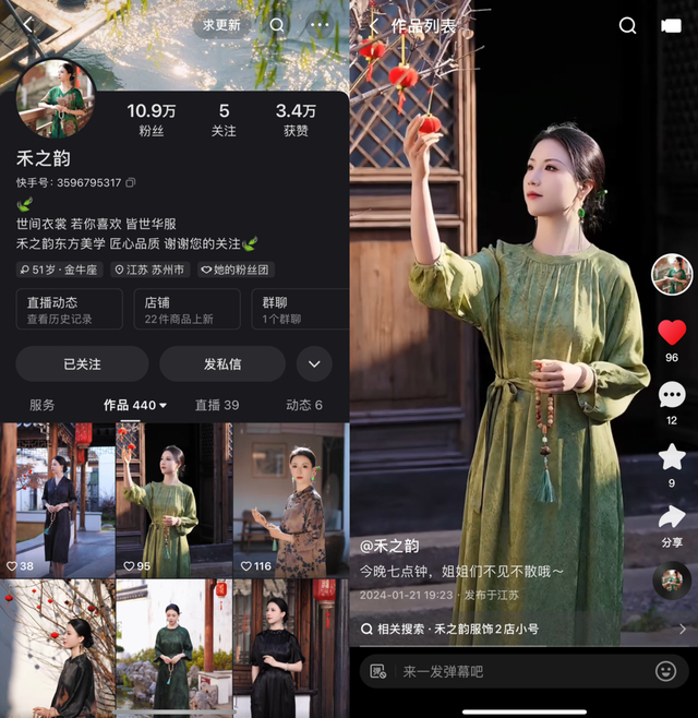 透过屏幕让粉丝感受到新中式服装之美,是快手服装主播“禾之韵”的愿望。在“禾之韵”品牌主理人芸芸看来,“买衣服的原因无非是因为喜欢,只要用心经营,不断传达自身理念,就肯定会有所收获”。