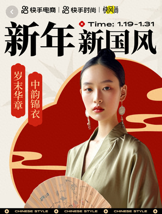 新中式服装融合了中国传统风格元素与现代化设计,体现了东方意境和神韵,1月19日-31日,快手电商推出以“岁末华章,中韵锦衣”为主题的「新年新国风」活动,借势快手商城年货节大促氛围,围绕新中式女装风格,为商家赋能,拉动销售增长。