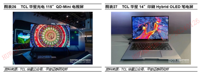在新技术探索方面,TCL华星光电布局全面,在Mini LED背光、QD、印刷OLED等方面均有深入布局,显示性能优异。CES 2024上,TCL华星光电携众多最新产品亮相,包括拥有7000:1原生对比度、DCI 99%影院级超高色域、大于178°超大可视角度的115”QD-Mini LED高端电视屏,以及拥有量产级240PPI、2.8K高分辨率、DCI-P3 100%色域覆盖率的全球首款14”印刷Hybrid OLED笔电显示屏等。TCL华星光电在Mini LED背光、QD、印刷OLED等新技术、新产品方面深入布局,市场竞争力稳步提升。