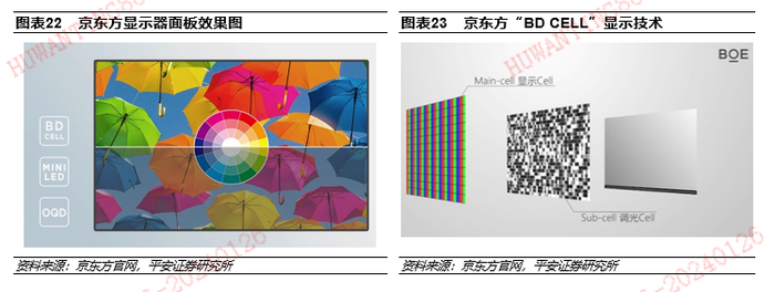 京东方对显示技术持续创新探索,助力其取得优异的市场成绩。根据京东方2022年年报,2022年,京东方在智能手机、平板电脑、笔记本电脑、显示器、电视等五大应用领域出货面积继续稳居全球第一;拼接、车载等创新应用领域出货量位列全球第一;柔性AMOLED持续保持增长势头,出货量进一步取得突破,同比增长超三成。总体来看,在技术创新的加持下,京东方在各大主流显示面板应用领域均取得了优异的成绩。