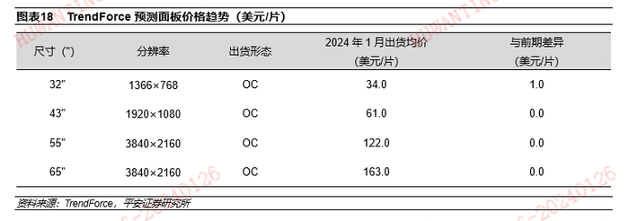 4、TrendForce信息,2024年1月下旬,32”、43”、55”、65”电视面板均价分别为34.0美元/片、61.0美元/片、122.0美元/片、163.0美元/片,32”面板涨价1.0美元,其余尺寸维持不变。