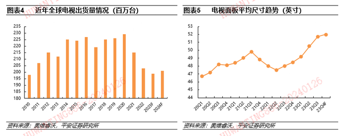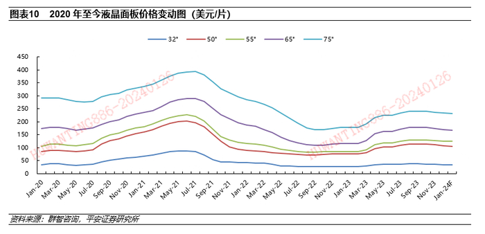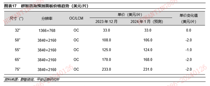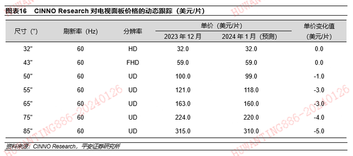 2、CINNO Research信息,2024年1月,预计32”、43”电视面板价格止跌,50”电视面板降幅为1.0美元,大尺寸55”-85”维持3-5美元的降幅,电视面板价格止跌回暖迹象明显。