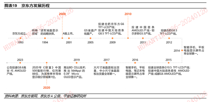 京东方自1993年成立以来,经过30余年的发展,目前已经成长为全球显示领域的龙头。京东方发展历程中的重要节点总结如下:1993年,京东方成立;1994年明确“进军液晶显示领域”战略;2001年京东方在A股上市;2005年北京京东方G5 TFT-LCD产线量产;2009年京东方投建中国大陆首条G8.5 TFT-LCD产线;2011年京东方投建中国首条AMOLED产线;2015年,京东方投建全球首条G10.5 TFT-LCD产线,并于同年投建中国首条柔性AMOLED产线-成都G6 AMOLED产线;2017年,京东方大尺寸、中小尺寸液晶面板出货量均位居全球第一;2023年京东方公告投建G8.6高世代AMOLED产线。