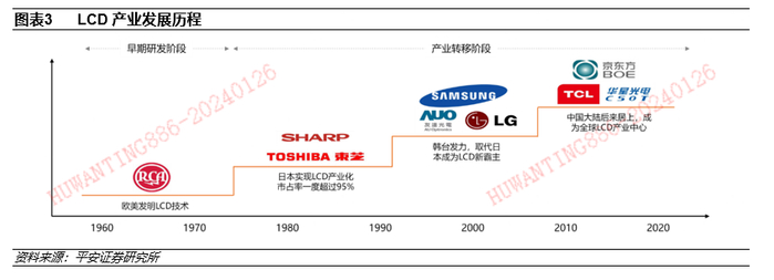 从LCD技术的发展历程来看,LCD主要经历了四个发展阶段,先后在美欧、日本、韩国、中国间发生了技术及产业转移:LCD最初的材料基础理论和应用研究主要集中在美国和德国,而日本则率先实现了真正意义上的产业化,之后韩国、中国台湾地区则利用逆周期投资成功取代日本成为LCD新霸主,到如今韩国、中国台湾的LCD产业日渐衰退,中国大陆则后来居上,在技术、产能等方面实现了全面超越。