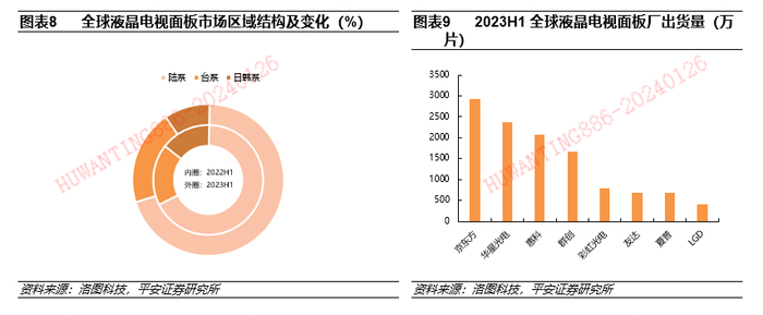 规模庞大的LCD产能集中在中国大陆,中国大陆面板厂市场份额高企。根据洛图科技数据,2023年H1,全球液晶电视面板出货量排名依次为:京东方、华星光电、惠科、群创、彩虹光电、友达、夏普、LGD,京东方、华星光电、惠科稳居前三;市场份额方面,根据洛图科技数据,2022年H1,中国大陆面板厂在LCD电视面板领域的全球份额为67.3%,牢牢占据LCD面板产业主导地位,2023年H1,该市场份额较2022年同期上涨2.7个百分点,达到70%,全球LCD电视面板的话语权基本掌握在中国大陆面板厂商手中。