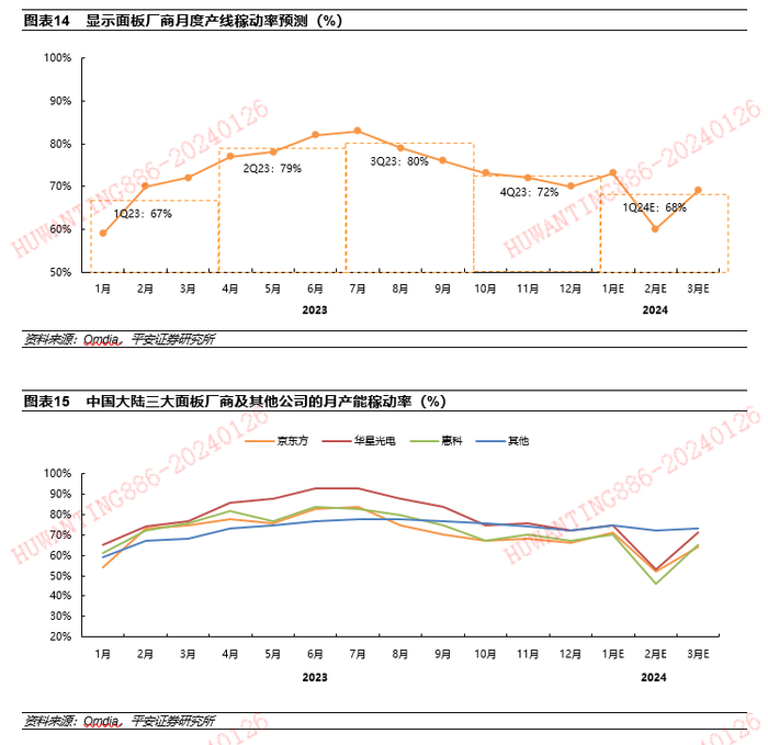 Omdia预计显示面板厂商的整体稼动率将在2024年Q1降至68%以下,稼动率下降将促使供给端逐渐往紧俏方向发展。根据Omdia显示研究首席分析师Alex Kang信息,中国大陆三大面板厂京东方、华星光电、惠科计划在2024年Q1大幅削减产能稼动率,且2月份有春节假期,显示面板产线的稼动率可能将低至60%。