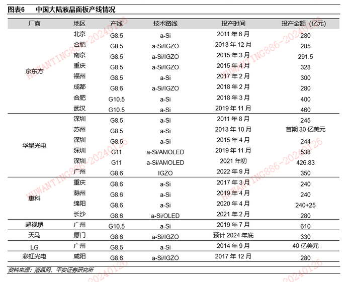 公司面板产品主要为电视面板和IT面板,根据公司招股说明书申报稿,2021年公司LCD电视面板出货量全球第三,LCD显示器面板出货量全球第六。公司的Oxide背板技术较为领先,已实现G8.6高世代Oxide RGB OLED背板开发及生产技术平台建设。