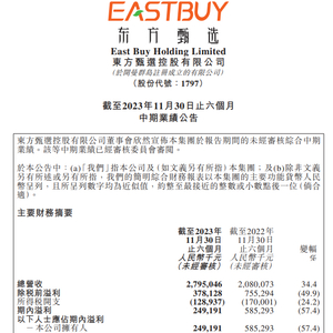 1月24日晚间,东方甄选发布了2024财年中期(2023年6月1日至11月30日)业绩。报告期内,公司共实现总营收27.95亿元,同比增长34.4%;净利润2.49亿元,同比下滑57.4%。
