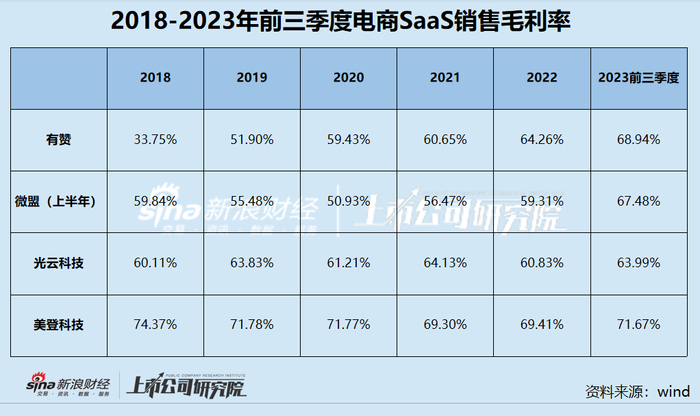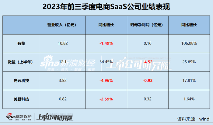 新浪财经上市公司研究院选取了有赞、微盟、光云科技、美登科技4家电商SaaS行业上市公司进行对比。其中,微盟由于未披露三季报,因此主要选用2023上半年业绩表现进行分析。