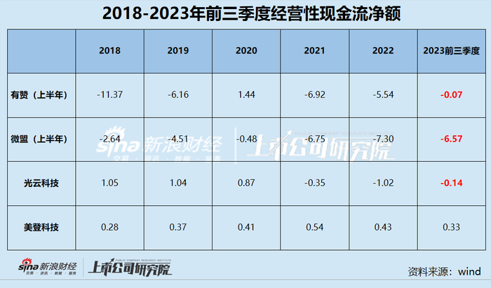 尽管部分盈利指标有所好转,但电商SaaS公司的“造血”能力依然不容乐观。2023年前三季度/上半年,有赞、微盟、光云科技的经营性现金流均处于净流出状态,分别为-0.07亿元、-6.57亿元、-0.14亿元。