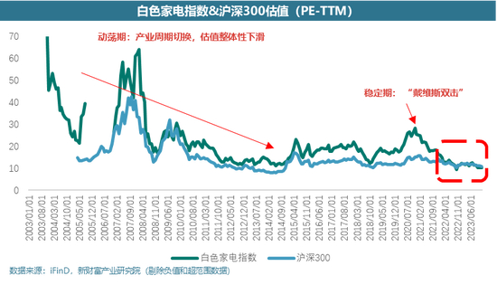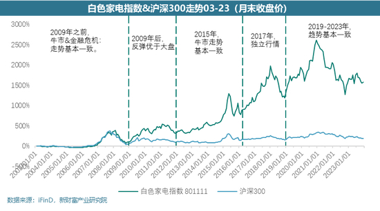 2009年之前,2007年牛市和2008年金融危机背景下,白色家电指数和大盘走势基本一致;2009、2010年白色家电相对收益开始体现逐步走阔;2011-2015年白色家电走势与大盘基本一致,但是弹性更大;2016、2017年白色家电走出了明显独立的行情;2018年-2023年白色家电走势更加贴近大盘,进本保持一致。