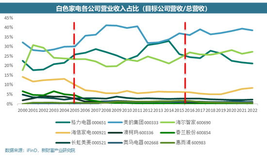 2005 年开始,企业分化明显,①部分企业(海信)由于经营失误,失去了市场份额。其营收占白电公司总体营收的比重从 9%一直下跌到 6%的水平。②尾部企业市场份额越来越少,以春兰股份为例,其营收占比从 2005 年的 1%不断下降至 2010 年接近 0 的水平。③头部企业展开拉锯战,市场份额波动起伏。其中以美的集团和格力电器为代表,两家企业体量之间的差距不断变大或变小。