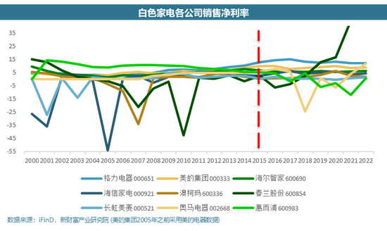 行业增速下降步入成熟期之后,首先将迎来一段动荡期:动荡期内企业各项经营指标先整体变坏,之后企业表现开始分化,头部企业开始好转。在动荡期前半段,企业整体的盈利指标变差,部分企业出现亏损,企业之间的市场份额处于不稳定状态。同时部分企业开始推出瞄准新市场的新产品,避开竞争日趋激烈的领域;少部分企业专注于已有市场,争取吃掉更大的蛋糕。在行业逐渐走入动荡期末期,企业间业绩进一步分化,龙头企业的盈利水平开始回升,行业整体的盈利状况开始好转。结合多项指标判断,白电行业的动荡期从2005 年开始,持续至 2015 年结束。