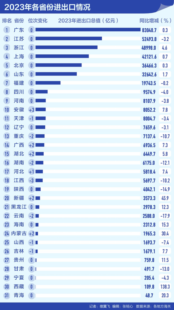 21世纪经济报道记者缴翼飞 北京报道 日前,各地海关陆续公布了2023年外贸进出口情况,以人民币计,进出口规模排名前十的省份分别是广东、江苏、浙江、上海、北京、山东、福建、四川、河南以及安徽。广东作为我国外贸第一大省,2023年进出口总值为83040.7亿元,超8万亿元,排名第一。江苏52493.8亿元,超5万亿元;浙江、上海超4万亿元,分别为48998.0亿元和42121.6亿元;北京36466.3亿元,山东32642.6亿元,超3万亿元。