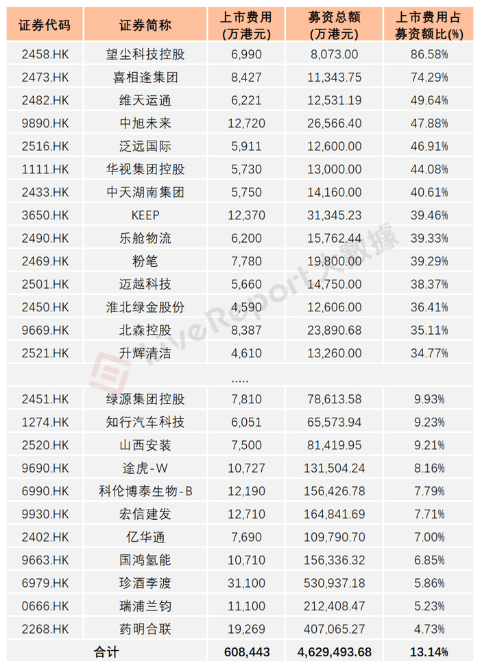 从上市费用占比看,上市费用占募资总额比例最高的三家公司分别为望尘科技控股、喜相逢集团及维天运通,比率分别为86.6%、74.3%及49.64%;占比最低的三家公司分别为药明合联、瑞浦兰钧及珍酒李渡,比率分别为4.73%、5.23%及5.86%。