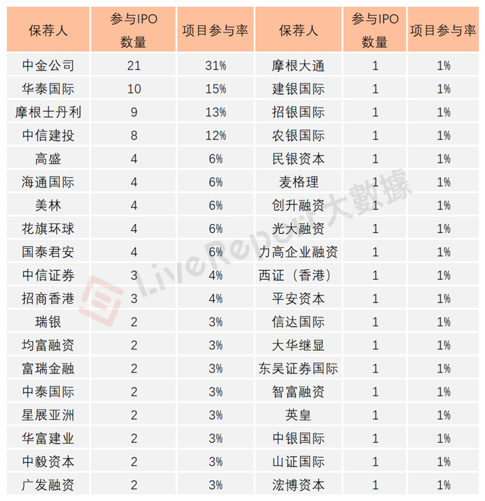 2023年,共有38间券商作为首发保荐机构参与了68家港股IPO新上市公司的保荐工作,其中,中金公司参与21只IPO新股保荐工作,项目参与率为31%,是年度参与港股新股IPO保荐最多的机构,蝉联香港IPO保荐人排行榜首位。