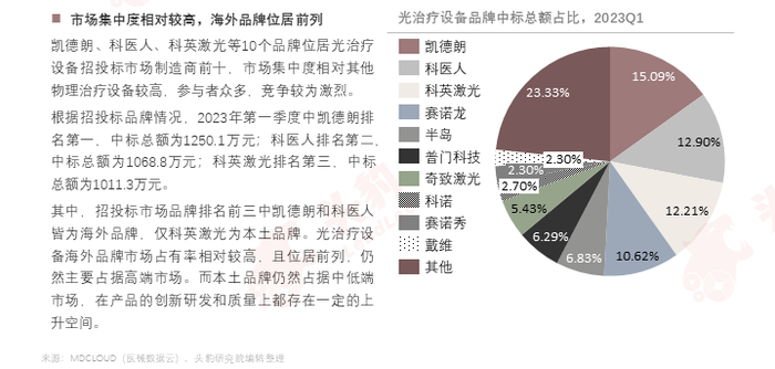 中国光治疗设备行业的竞争格局较分散,主要分为三个梯队:第一梯队为全球光治疗设备行业龙头,占据了光治疗设备行业高端市场份额,其在中国市场销售数量不多,但单价较高;第二梯队以中国公司为代表,主要占据中低端光治疗设备市场,已形成一定的生产销售规模,占比较大;第三梯队同样占据中低端光治疗设备市场,但企业规模较小。