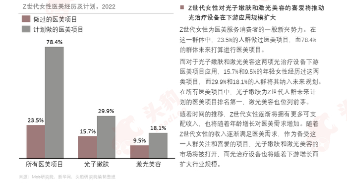 由于年轻人学习和工作压力的增加、作息方式的变化、颜值经济的崛起、消费意识的改变等因素,医美消费年龄逐渐前置,Z世代人群逐渐成为医美消费主力人群。医美领域年轻人群的涌现将促进医美消费的增长,增加对如光治疗设备等上游医美设备的需求,从而使得光治疗设备的市场规模得到进一步的扩大。