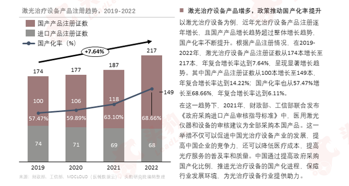 以激光治疗设备为例,近年光治疗设备产品注册逐年增长,且国产产品增长趋势超过整体增长趋势,国产化率不断提升。