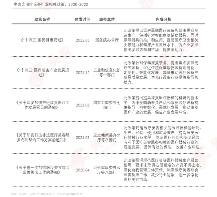 医疗器械、康复医疗等行业相关政策鼓励医疗器械、康复辅具的研发创新,推动医疗装备系统化、定制化、智能化发展;医疗美容行业相关政策强调提高监管力度,保障光治疗设备产业发展环境。