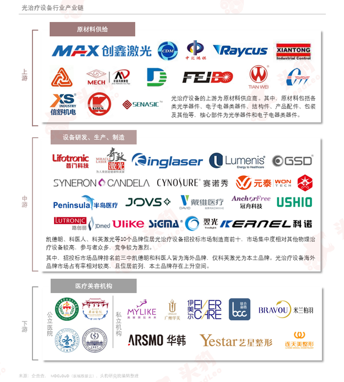 光治疗设备产业链上游为原材料供应商,中游为光治疗设备生产商,下游为医美机构、康复医疗机构及终端消费者;光治疗设备产业链的供给和需求都在增长,中游对上下游的议价能力都较强。
