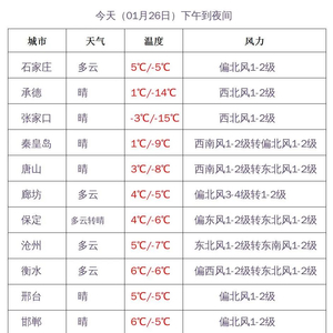 今天傍晚到夜间,保定、廊坊及以南地区多云转晴,其他地区晴间多云。最低气温,张家口、承德、保定西北部、秦皇岛北部、唐山北部-26~-12℃,其他地区-11~-3℃。