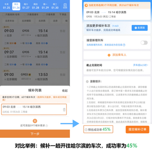 增加候补列车数,以北京至哈尔滨候补购票为例。候补一个车次,预估成功率为45%,候补五个车次,预估成功率为80%。