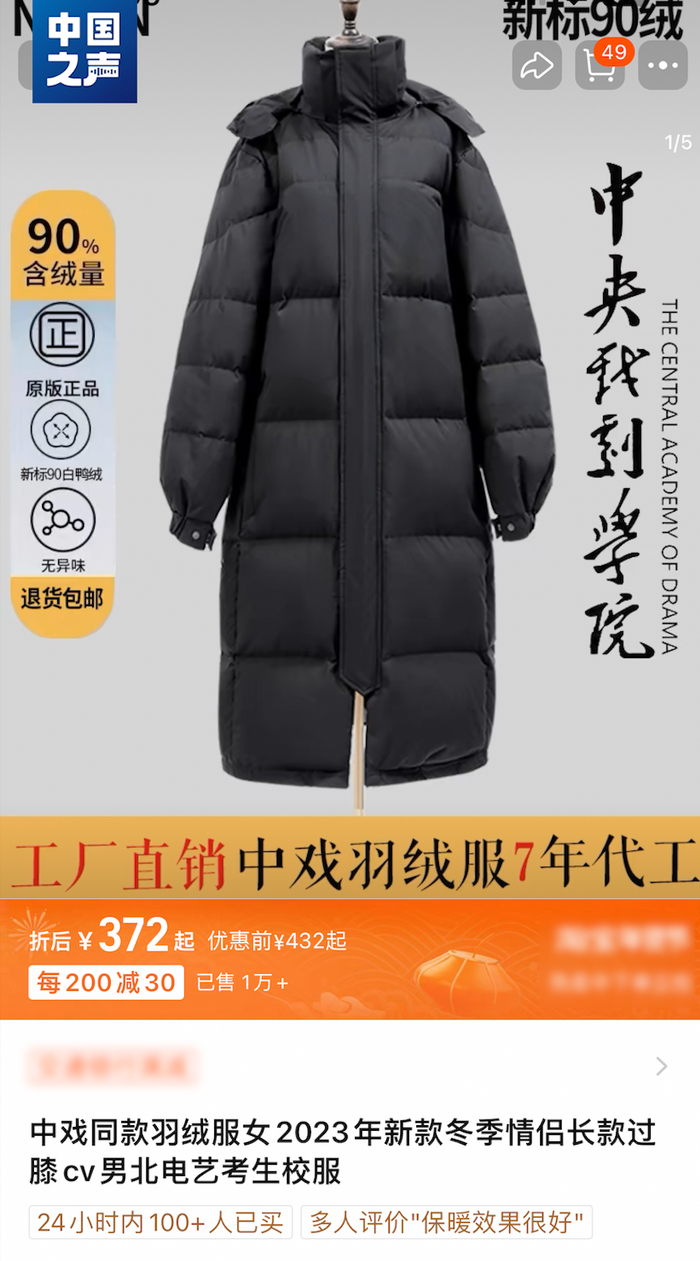 艾丽代表着粉丝买家群体。她向记者介绍,购买中央戏剧学院羽绒服,是因为看到商家宣传“刘昊然、易烊千玺同款”,是不少明星们的拍戏“开工服”,粉丝愿意下单。