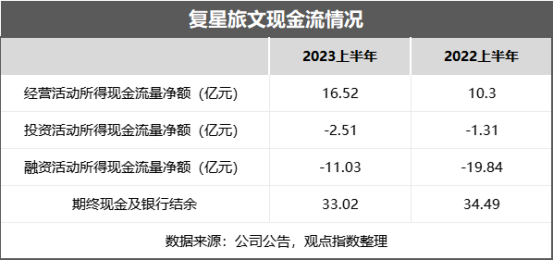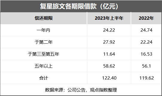 截至2023年6月30日,复星旅文债务总额撇除租赁负债为122.41亿元,同比增加2.3%。其中24.23亿元需在一年内偿还。而复星旅文现金及银行结余为33.02亿元,同比增加10.7%,未动用银行融资合计为29.30亿元。