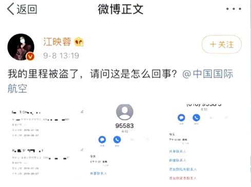 比如,2020年9月,曾曝出多位明星航空里程被盗刷一事。据专家分析,这可能是航空公司内部人员与外部人员的里应外合,也可能是不法分子偷用明星相关信息。黑票代盗用个人里程后兑换机票,并从中牟利。